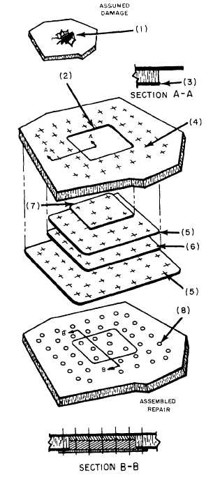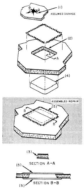 Figure 14-17.Balsa wood repair with filler plug and fabric patch.Locate the patch plates and wood filler. Using the pilot holes in the panel as a guide, drill pilot holes through the patch plates and wood filler. The patch plates and wood filler are then bonded to the panel using the specified adhesive. Next, locate the metal filler, and drill pilot holes through both patch plates and the wood filler.All pilot holes are then size drilled and machine or press countersunk, as applicable. Complete the repair by installing the specified rivets. See (8) of figure 14-18.