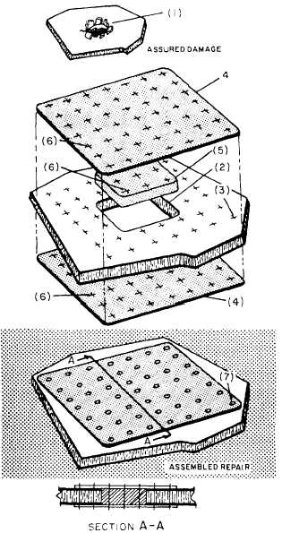 Figure 14-19.Balsa wood repair with nonflush patch. Trailing edge repairs to all-metal construction assemblies and/or control surfaces are performed by using basically the same procedures outlined in the chapter titled "Aircraft Metallic Repair." A typical trailing edge repair to a sandwich construction assembly is shown in figure 14-20.You may use the lap or flush patch, depending on the size of the damage, the type of aircraft, and the assembly or control surface to be repaired. Normally, the flush patch is used on control surfaces to ensure aerodynamic smoothness. |
