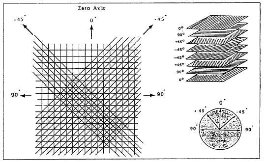 Figure 14-24.-Standard ply orientation clock. 80 percent composites. As a structural mechanic, you will be required to maintain these new types of aircraft. To be proficient, you must be able to recognize the types of damage, understand the processes involved in damage assessment, inspection, and repair of composite materials. As new materials are introduced, new repair procedures will be required. It will be your responsibility to keep abreast of these developments.Composite materials damage may be categorized as either environmental or physical. Environmental damage includes crazing and cracking caused by solar and ultraviolet radiation, water absorbed through humidity and rain, and lightning strike damage. Lightning strikes can cause holes to be burned in the structure, puncturing and splintering, and it has been known to weld bearings and hinges. Physical damage is caused by an applied force or deficiency in fabrication, such as dents, scratches, cracks, cuts and abrasions, pits, voids, disbonds, delamination, core crush on sandwich structures, and impact damage.ASSESSMENT OF COMPOSITE MATERIAL DAMAGE The task of repair begins when you determined that the structure has been damaged and that the damage is sufficient to require the structure to be repaired. The existence of damage may be obvious, such as a skin penetration, a gouge, or a dent. Con-versely, the proper identification and classification of the damage may be difficult. Because of the brittle, elastic nature of composite laminate materials, for example, the fibers may break upon impact, but then spring back, leaving little visible indication of damage.There are three distinct steps involved in damage assessment. The first step is to locate the damage. The second step is to evaluate the defect to determine such information as the defect type, depth, and size. This information is important because the method of repair will vary, depending on this information. The third step is to re-evaluate, after defect removal (as applicable), the area being repaired. |