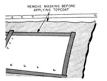Figure 14-30.-Masking prior to paint touchup. The mixed epoxy-polyamide primer can be thinned to obtain the proper viscosity for spraying. However, you should check the local air pollution regulations for restrictions and regulations regarding the use of certain solvents and thinners. To spray epoxy-polyamide primer, you should thin it with MIL-T-81772, type II (preferred) or type I. The thinned primer should be stirred thoroughly, strained, and allowed to stand for a minimum of 15 minutes prior to spraying it. The thinning ratio may vary to obtain the proper spraying viscosity, which is 17 to 18 seconds in a No. 2 Zahn cup. The 15-minute standing time permits the components to enter into chemical reaction, reduce cratering, preclude the clear resin component from "sweating out" or separating, and to allow any bubbles (formed while stirring) to escape.WARNING You should wear goggles when mixing or using thinners and solvents. You should also wear goggles or a face shield, respirator, rubber gloves, and coveralls during all paint touchup and paint spraying. Eating, drinking, or smoking should NOT be allowed in areas where paint or solvent is being used or stored.Before you apply the primer, ensure that the surface has been cleaned, chemically treated, and prepared for spraying. Then, apply a cross coat of epoxy-polyamide primer and allow the coat to air dry for 1 hour. The total dry film thickness of primer should be 0.6 to 0.9 mil. If the temperature is below 70F, you should allow 2 to 3 hours for drying. Do not spray if the temperature is below 50F. |