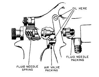Figure 14-38-Spray gun lubrication points. To clean a pressure-feed gun, you should back off the fluid needle adjusting screw. Then, release the pressure from the pressure tank with the relief or safety valve. Hold a cloth over the air cap and operate the gun trigger. The cloth forces the spray material back into the pressure tank (fig. 14-37). Remove the fluid hose from the gun and the pressure tank. Attach a hose cleaner to the hose and run thinner or suitable solvent through it. Clean the air cap by using the same method as the suction gun air cap. NOTE: Do not immerse an entire spray gun in cleaning materials, such as cleaning solvents and thinners. These materials dissolve the oil from leather packings and cause the gun to have an unsteady spray.The gun, fluid needle packing, air valve stem, and trigger bearing screw require frequent lubrication. You should remove the fluid needle packing before using the gun and soften it with oil. The fluid needle spring should be coated with grease according to the manufacturers instructions. See figure 14-38.