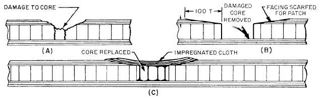 Repairing Facing and Core Damage The repair of facings and cores requires more than one method of repair. Special attention must be given to the type of core used. HONEYCOMB CORE. The repair of facings and cores requires more than one method of repair. Special attention must be given to the type of core used. Damages extending completely through one facing of the material and into the core require removal of the damaged core and replacement of the damaged facings in such a manner that normal stresses can be carried over the area. The scarfed method, illustrated in figure 14-11, is the preferred method for accomplishing small repairs of this type. Repairs of this type maybe accomplished as follows:Carefully trim out the damaged portion to a circular or oval shape and remove the core completely to the opposite facing. Be careful not to damage the opposite facing. The damaged facing around the trimmed hole is then scarfed back carefully by sanding. The length of the scarf should be at least 100 times the facing thickness, as shown in view B of figure 14-11. This scarfing operation must be done very accurately to a uniform taper. Cut a piece of replacement core material (or a suitable substitute) to fit snugly in the trimmed hole. It should be equal in thickness to the original core material. Brush coat the repair area and the replacement honeycomb, exercising care to prevent an excessive amount of resin from entering the honeycomb cells. Insert the honeycomb repair section and place the resin-impregnated cloth over the repair area, as shown in view C of figure 14-11. Cover the repair area with cellophane sheeting, and cure the repair in accordance with the resin manufacturers instructions. After the repair has been cured, sand the surface to its original contour. The entire area should be lightly sanded before refinishing. FOAM CORE. The damaged core should be removed by cutting perpendicular to the surface of the face laminate opposite the damaged face. Scrape the inner facing surface clean, making sure there is no oil or grease film in the area, to ensure good bondage of the foam to the laminate. Fill the area where the core has been removed with the tiller material specified in the aircraft structural repair manual. Figure 14-12 shows the replacement of a foam core.NOTE: Do not use MEK to clean the damage as it may soften and weaken the foam.Repairing Puncture Damage The repair of punctures differs as to the method used. Repair of honeycomb cores is different than the repair of foam cores.