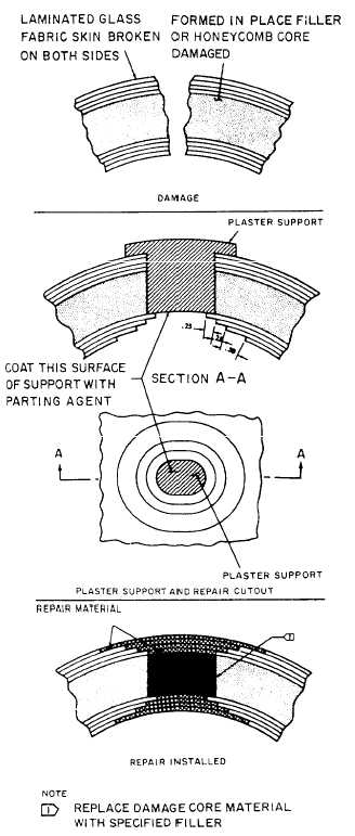 Finishing Repaired Areas In the repair of reinforced plastic parts, the final step is to refinish the part with a finish identical to the original, or an acceptable substitute. In refinishing radomes and other surfaces that enclose electronic equipment, consult NAVAIR 01-1A-22. Do not use metallic pigmented paints or other electronic reflective-type materials because of undesirable shielding and interference effects. Always use the materials recommended in the applicable structural repair manual for refinishing both the interior and exterior surfaces of reinforced plastic components. Reinforced plastic components whose frontal areas are exposed to high speeds are frequently coated with a rain erosion coating. Rain erosion coatings protect the component against pits that are caused by raindrops hitting the component at high aircraft speeds. These pits or eroded areas can cause delamination of the component glass cloths if allowed to progress unchecked.Rain erosion-resistant coatings for reinforced plastic components conform to Specification MIL-C-7439. Coatings that conform to this specifi-cation are classified as Class I and Class II.Class I is a rain erosion-resistant coating that is furnished in kit form. This kit consists of a primer, accelerator, diluting solvent, and neoprene. Class II is a rain erosion-resistant coating with an additional surface treatment to minimize radio noise resulting from precipitation static on the coated surface. This coating is also supplied in kit form and consists of a primer, accelerator, diluting solvent, neoprene, and antistatic coating.These kits (MIL-C-7439, Classes I and II) are packaged unaccelerated to provide longer shelf life. The neoprene is ready to use only after the catalyst (accelerator) has been added. The material in these kits should be mixed and applied in accordance with the instruction sheet supplied by the kit manufacturer.