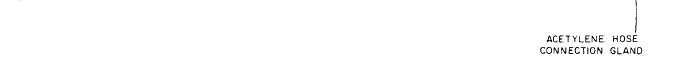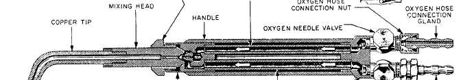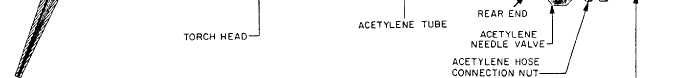 Figure 15-29.-Equal pressure welding torch. handle are made of seamless hard brass, copper-nickel alloy, stainless steel, or other noncorrosive metals of adequate strength. There are two types of welding torchesthe low-pressure or injector type and the equal-pressure type. In the low-pressure or injector type (fig. 15-28), the acetylene pressure is less than 1 psi. A jet of high-pressure oxygen is used to produce a suction effect to draw in the required amount of acetylene. This is accomplished by the design of the mixer in the torch, which operates on the injector principle. The welding tips may or may not have separate injectors designed integrally with each tip. The equal pressure torch (fig. 15-29) is designed to operate with equal pressures for the oxygen and acetylene. The pressure ranges from 1 to 15 psi. This torch has certain advantages over the low-pressure type because the flame can be more readily adjusted, and since equal pressures are used for each gas, the torch is less susceptible to flashbacks. The welding tips are made of hard, drawn, electrolytic copper or 95-percent copper and 5-percent tellurium. They are made in various styles and types, some having a one-piece tip either with a single orifice or a number of orifices, and others with two or more tips attached to one mixing head. The diameters of the tip orifices differ to control the quantity of heat and the type of flame. These tip sizes are designated by numbers that are arranged according to the individual manufacturers system. In general, the smaller the number, the smaller the tip orifice. No matter what type or size tip you select, the tip must be kept clean. Quite often the orifice becomes clogged with slag. When this happens, the flame will not burn properly. Inspect the tip before you use it. If the passage is obstructed, you can clear it with wire tip cleaners of the proper diameter, or with soft copper wire. Tips should not be cleaned with machinists drills or other sharp instruments. These devices may enlarge or scratch the tip opening and greatly reduce the efficiency of the torch tip. HOSE. The hose used to make the connection between the torch and the regulators is strong, nonporous, light, and flexible to make the torch movements easy. It is made to withstand high internal pressures, and the rubber used in its manufacture is chemically treated to remove sulfur to avoid the danger of spontaneous combustion. The oxygen hose is GREEN, and the acetylene hose is RED. The hose is a rubber tube with braided or wrapped cotton or rayon reinforcements and a rubber covering. The hoses have connections at each end so they can be connected to their respective regulator outlet and torch inlet connections. To prevent a dangerous interchange of acetylene and oxygen hoses, all threaded fittings used for the acetylene hookup are left-handed threads, and all threaded fittings for oxygen hookup are right-handed threads. The hoses are obtainable as a single hose for each gas or with the hoses bonded together along their length under a common outer rubber jacket. This type prevents the hose from kinking or becoming entangled during the welding operation.LIGHTERS. -A flint lighter is provided for igniting the torch. The lighter consist of a file-shaped piece of steel, usually recessed in a cuplike device, and a piece of flint that can be drawn across the steel, which produces the sparks required to light the torch.WARNING Matches should never be used to ignite a torch; their length requires bringing the hand too close to the tip to ignite the gas. Accumulated gas may envelope the hand and, when ignited, cause a severe burn.GOGGLES. -Welding goggles are fitted with colored lenses to keep out heat and light rays and to protect the eyes from sparks and molten metal. Regardless of the shade of lens used, goggles should be protected by a clear cover glass. The welding operator should select the shade or density of color that is best suited for his/her particular work. The desired lens is the darkest shade that will show a clear definition of the work without eyestrain. Goggles should fit closely around the eyes, and should be worn at all times during welding and cutting operations. Special goggles, using standard lenses, are available for use with spectacles.WELDING (FILLER) RODS. -The use of the proper type of filler rod is very important in oxyacetylene welding operations. This material not only adds reinforcement to the weld area, but also adds desired properties to the finished weld. By selecting the proper type of rod, either tensile strength or ductility can be secured in a weld. Similarly, rods can be selected that will help retain the desired amount of corrosion resistance. In some cases, a suitable rod with a lower melting point will eliminate possible cracks from expansion and contraction. Welding rods are classified as ferrous and nonferrous. The ferrous rods include carbon and alloy steel rods as well as cast iron rods. Nonferrous rods include brazing and bronze rods, aluminum and aluminum alloy rods, magnesium and magnesium alloy rods, copper rods, and silver rods. The diameter of the rod used is governed by the thickness of the metals being joined. If the rod is to small, it will not conduct heat away from the puddle rapidly enough, and a burned weld will result. A rod that is to large will chill the puddle. As in selecting the proper size welding torch tip, experience will enable the welder to select the proper diameter welding rod. |
