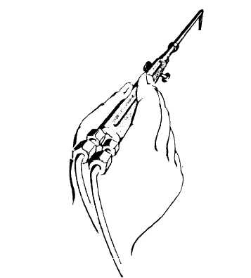 Figure 15-30.-Welding light gauge metals. dirt or slag in the end of the tip. A backfire is rarely dangerous, but the molten metal may be splattered when the flame pops. A flashback is the burning of the gases within the torch, and it is dangerous. It is usually caused by loose connections, improper pressures, or overheating of the torch. A shrill hissing or squealing noise accompanies a flashback; and unless the gases are turned off immediately, the flame may burn back through the hose and regulators and cause great damage. The cause of a flashback should always be determined, and the trouble remedied before relighting the torch. Fundamental Welding Techniques The composition, thickness, shape, and position of the metal to be welded govern the techniques to be used. The fundamental techniques that apply to different thicknesses, shapes, and positions of the metal to be welded are discussed in the following paragraphs.HOLDING THE TORCH. -The proper method to use in holding the torch depends upon the thickness of the metal being welded. For light gauge metal, hold the torch as shown in figure 15-30, with the hose draped over the wrist. For heavier work, hold the torch as shown in figure 15-31.