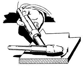 Figure 15-46.-Breaking the arc. the plate. Figure 15-45 shows the procedure for starting the arc. The high-frequency current will jump the gap between the electrode and the plate, establishing the arc. Be sure the downward motion is made rapidly to provide the maximum amount of gas protection to the weld zone. If a dc machine is used, hold the torch in the same position; but in this case, the electrode can touch the plate to start the arc. When the arc is struck, withdraw the electrode so it is about 1/8 inch above the work piece. STOPPING THE ARC. To stop an arc on the ac or dc machine, swing the electrode back to the horizontal position, as shown in figure 15-46. Make this movement rapidly to avoid marring or damaging the weld surface. Some machines are equipped with a foot pedal to permit a gradual decrease of current. With such control, it is easier to fill the crater completely and prevent crater cracks.CAUTION If you are using a water-cooled cup, do not allow the cup to come in contact with the work when the current is on. The hot gases may cause the arc to jump the electrode to the cup instead of the plate, thereby damaging the cup. Be sure that the water flow is set according to the manufacture's recom-mendations. |