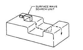Figure 15-15.-Surface-wave inspection. inspection of cylindrical components, examination of skins for cracks, and inspection of welds. Figure 15-14 shows typical angle-beam inspections. -The surface-wave method projects a beam of vibrations that travel along the surface and just below the surface of the material. When surface waves are used to inspect painted surfaces, you should exercise caution during set up and interpretation due to the possibility of surface reflection from scratches and breaks in the painted surface. Surface-wave inspections can be used in many field NDI applications