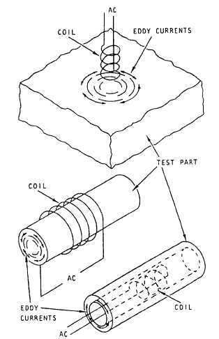 Figure 15-16.-Generation of eddy currents in various part con-figurations. involving surface cracks or slightly subsurface discontinuities. On smooth surfaces, sound energy can travel long distances with little energy loss. Surface waves travel around curved corners, and they reflect at sharp edges. Rough surfaces or liquid on the surface attenuate surface waves so the area in front of the search unit must be kept clear of couplant. Figure 15-15 shows a typical surface-wave inspection.Eddy Current Inspection Eddy currents are electrical currents induced in a conductor of electricity by reaction with a magnetic field. The eddy currents are circular in nature, and their paths are oriented perpendicular to the direction of the applied magnetic field. In general, during eddy current testing, the varying magnetic field(s) is/are generated by an alternating electrical current (ac) flowing through a coil of wire positioned immediately adjacent to the conductor, around the conductor, or within the conductor. Figure 15-16 shows eddy currents flowing in various configurations.