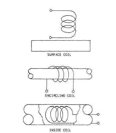 Figure 15-17.-Basic coil configurations. COILS AND PROBES. -Eddy current coils and probes consist of one or more coils of wire designed to introduce a varying magnetic field into a part to determine the effects of test variables on this magnetic field. Generation of the magnetic field results from an alternating current flowing through the coil. A fundamental consideration in selecting an eddy current probe or test coil is its intended use. A small diameter probe or narrow encircling coil will provide increased resolution of small defects. A larger probe or wider encircling coil will provide better averaging of bulk properties. |