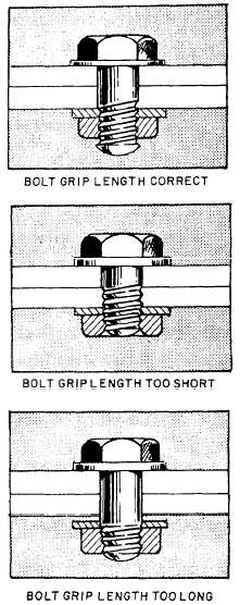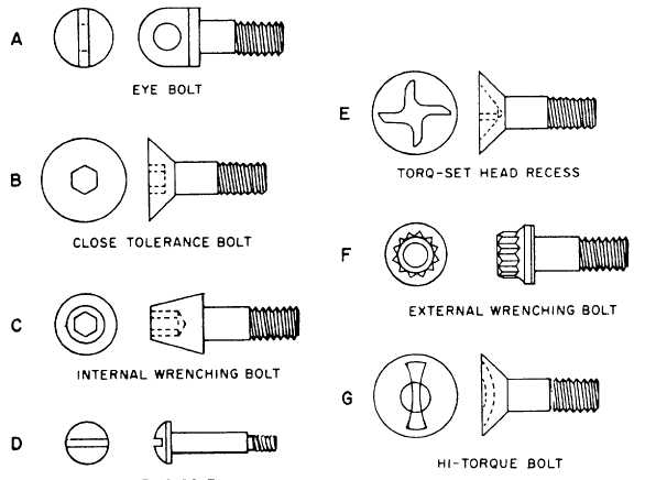 Figure 2-21.Bolt heads. head-hex bolt has three holes drilled in the head, connecting opposite sides of the hex.Seven additional types of bolt heads are shown in figure 2-21. Notice that view A shows an eyebolt, often used in flight control systems. View B shows a countersunk-head, close-tolerance bolt. View C shows an internal-wrenching bolt. Both the countersunk-head bolt and the internal-wrenching bolt have hexagonal recesses (six-sided holes) in their heads. They are tightened and loosened by use of appropriate sized Allen wrenches. View D shows a clevis bolt with its characteristic round head. This head may be slotted, as shown, to receive a common screwdriver or recessed to receive a Reed-and-Prince or a Phillips screwdriver.View E shows a torque-set wrenching recess that has four driving wings, each one offset from the one opposite it. There is no taper in the walls of the recess. This permits higher torque to be applied with less tendency for the driver to slip or cam out of the slots.View F shows an external-wrenching head that has a washer face under the head to provide an increased bearing surface. The 12-point head gives a greater wrench gripping surface.View G shows a hi-torque style driving slot. This single slot is narrower at the center than at the outer portions. This and the center dimple provide the slot with a bow tie appearance. The recess is also undercut in a taper from the center to the outer ends, producing an inverted keystone shape. These bolts must be installed with a special hi-torque driver adapter. They must also be driven with some type of torque-limiting or torque-measuring device. Each diameter of bolt requires the proper size of driver for that particular bolt. The bolts are available in standard and reduced 100-degree flush heads. The reduced head requires a driver one size smaller than the standard head. |