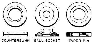socket-head, pan-head and truss-head types. Flush-Head. Flush-head machine screws are used in countersunk holes where a flush finish is desired. These screws are available in 82 and 100 degrees of head angle, and have various types of recesses and slots for driving. Round-Head. Round-head machine screws are frequently used in assembling highly stressed aircraft components.Fillister-Head. Fillister-head machine screws are used as general-purpose screws. They may also be used as cap screws in light applications such as the attachment of cast aluminum gearbox cover plates.Socket-Head. Socket-head machine screws are designed to be screwed into tapped holes by internal wrenching. They are used in applications that require high-strength precision products, compactness of the assembled parts, or sinking of the head into holes.Pan- and Truss-Head. Pan-head and truss-head screws are general-purpose screws used where head height is unimportant. These screws are available with cross-recessed heads only.SELF-TAPPING SCREWS. A self-tapping screw is one that cuts its own internal threads as it is turned into the hole. Self-tapping screws can be used only in comparatively soft metals and materials. Self-tapping screws may be further divided into two classes or groups: machine self-tapping screws and sheet metal self-tapping screwsMachine self-tapping screws are usually used for attaching removable parts, such as nameplates, to castings. The threads of the screw cut mating threads in the casting after the hole has been predrilled. Sheet metal self-tapping screws are used for such purposes as temporarily attaching sheet metal in place for riveting. They may also be used for permanent assembly of nonstructural parts, where it is necessary to insert screws in blind applications.CAUTION Self-tapping screws should never be used to replace standard screws, nuts, or rivets in the original structure. Over a period of time, vibration and stress will loosen this type of fastener, causing it to lose its holding ability.WASHERS Washers such as ball socket and seat washers, taper pin washers, and washers for internal-wrenching nuts and bolts have been designed for special applications. See figure 2-31.Ball socket and seat washers are used where a bolt is installed at an angle to the surface, or where perfect alignment with the surface is required at all times.These washers are used together. Taper pin washers are used in conjunction with threaded taper pins. They are installed under the nut to effect adjustment where a plain washer would distort.Washers for internal-wrenching nuts and bolts are used in conjunction with NAS internal-wrenching bolts. The washer used under the head is countersunk to seat the bolt head or shank radius. A plain washer is used under the nut.