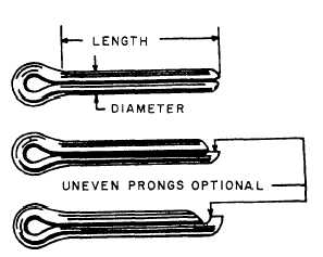 Figure 2-57.Types of cotter pins. AIRCRAFT SAFETYING METHODS Learning Objective: Identify the various safety methods used on aircraft hardware.You will come in contact with many different types of safetying materials. These materials are used to stop rotation and other movement of fasteners. They are also used to secure other equipment that may come loose due to vibration in the aircraft. COTTER PINS Cotter pins are used to secure bolts, screws, nuts, and pins. Some cotter pins are made of low-carbon steel, while others consist of stainless steel and are more resistant to corrosion. Also, stainless steel cotter pins may be used in locations where nonmagnetic material is required. Regardless of shape or material, all cotter pins are used for the same general purposesafetying. Figure 2-57 shows three types of cotter pins and how their size is determined.NOTE: Whenever uneven prong cotter pins are used, the length measurement is to the end of the shortest prong. |