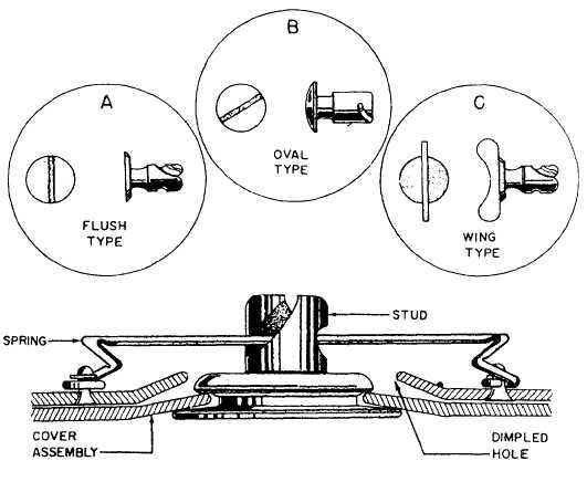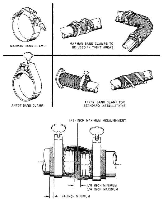 Figure 2-12.Dzus fastener. Some of the most commonly used plain-band couplings are shown in figure 2-13. When you install a hose between two duct sections, the gap between the duct ends should be a minimum of 1/8 of an inch and a maximum of 3/4 of an inch. When you install the clamps on the connection, the clamp should be 1/4 of an inch from the end of the connector. Misalignment between the ducting ends should not exceed 1/8 of an inch.Marman clamps are commonly used in ducting systems and should be tightened to the torque value indicated on the coupling. Tighten all couplings in the manner and to the torque value specified on the clamp or in the applicable maintenance instruction manual.When you install flexible couplings, such as the one shown in figure 2-14, the following steps are recommended to assure proper security:1. Fold back half of the sleeve seal and slip it onto the sleeve.