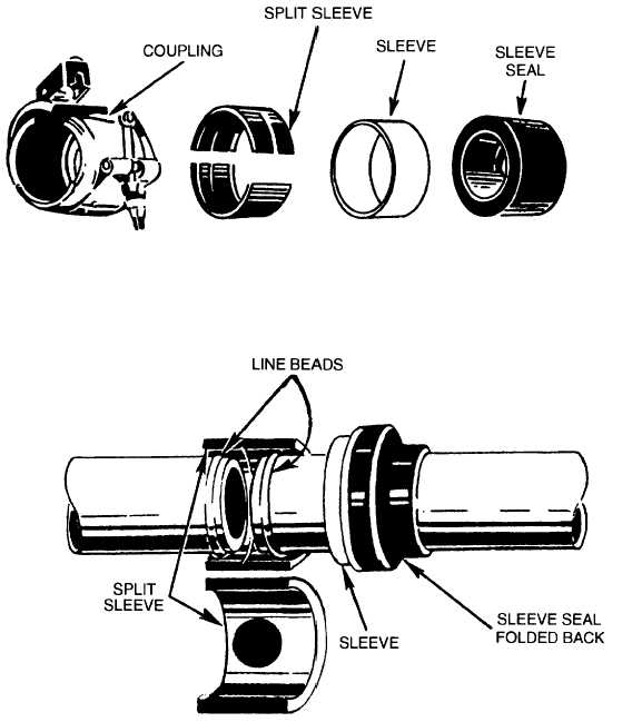 Figure 2-15.Installation of rigid line couplings. 2. Slide the sleeve (with the sleeve seal partially installed) onto the line.3. Position the split sleeves over the line beads. 4. Slide the sleeve over the split sleeves, and fold over the sleeve seal so it covers the entire sleeve. 5. Install the coupling over the sleeve seal and torque to correct value. |