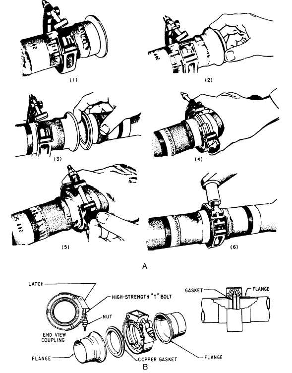 Miscellaneous Fasteners Some fasteners cannot be classified as rivets, turnlocks, or threaded fasteners. Included in this category are connectors, couplings, clamps, taper and flat-head pins, snap rings, studs, and heli-coil inserts.FLEXIBLE CONNECTORS AND COUPL-INGS. A variety of clamping devices are used in connecting ducting sections to each other or to various components. Whenever lines, components, or ducting are disconnected or removed for any reason, you should install suitable plugs, caps, or coverings on the openings to prevent the entry of foreign materials. You should also tag the various parts to ensure correct reinstallation. You should exercise care during handling and installation to ensure that flanges are not scratched, distorted, or deformed. Flange surfaces should be free of dirt, grease, and corrosion. The protective flange caps should be left on the ends of the ducting until the installation progresses to the point where removal is necessary. In most cases it is mandatory to discard and replace seals and gaskets. You should ensure that seals and gaskets are properly seated and that mating and alignment of flanges are fitted. This will prevent the excessive torque required to close the joint, which imposes structural loads on the clamping devices. Adjacent support clamps and brackets should remain loose until installation of the coupling has been completed.