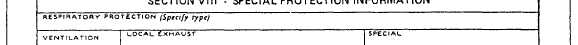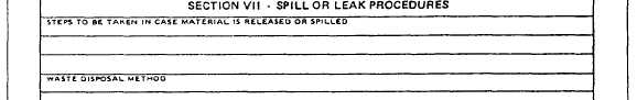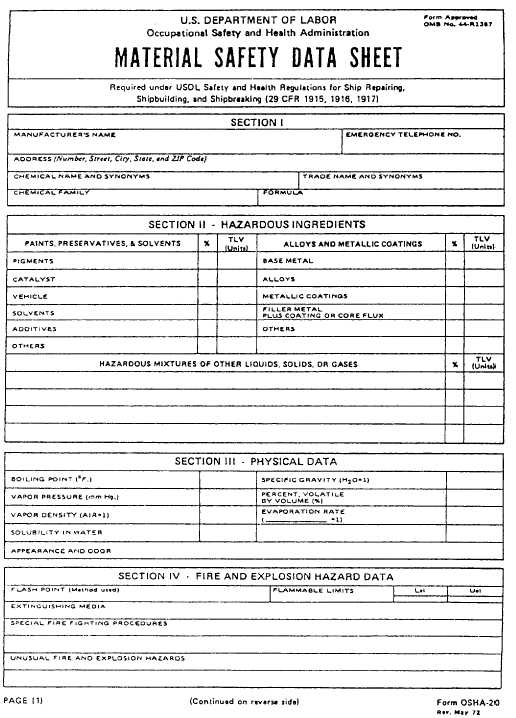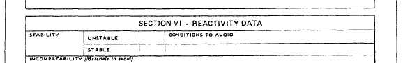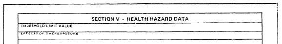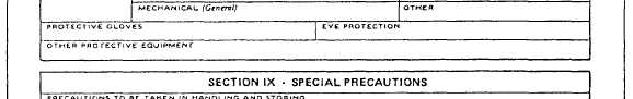 WORK CENTER RESPONSIBILITIES All work center supervisors have specific responsibilities under the TCP. All tool containers should have a lock and key as part of their inventory. The supervisor should be aware of the location of each containers keys and have a way of controlling them. When work is to be completed away from the work spaces (for example, the flight line/flight deck), complete tool containers, not a handful of tools, should be taken to the job. If more tools are needed than the tool container contains, tool tags can be used to check out tools from other tool containers in the work center or from another work center. The following is a list of additional responsibilities of the work center supervisor:1. Upon task assignment, note the number of the tool container on copy 1 of the VIDS/MAF, left of the accumulated work hours section. A sight inventory will be conducted by the technician prior to commencement of each task, and all shortages will be noted. Every measure must be taken to ensure that missing tools do not become a cause of FOD. Inventories will also be performed before a shift change, when work stoppage occurs, after maintenance has been completed, and before conducting an operational systems check on the equipment.2. When all tools are accounted for and all maintenance actions have been completed, the work center supervisor signs the VIDS/MAF, signifying that maintenance has been completed and that all tools have been accounted for. 3. If any tool is found to be missing during the required inventories, conduct an immediate search prior to reporting the work completed or signing off the VIDS/MAF. If the tool cannot be located, notify the maintenance officer or assistant maintenance officer via the work center supervisor and maintenance control to ensure that the aircraft or equipment is not released. If the tool cannot be located after the maintenance officers directed search, the person doing the investigation will personally sign a statement in the Corrective Action block of the VIDS/MAF that a lost tool investigation was conducted and that the tool could not be found. Subsequently, the normal VIDS/MAF completion process will be followed. The flight engineer/crew chief (senior maintenance man in the absence of an assigned crew chief) will assume the responsibilities of the work center supervisor applicable to the TCP in the event of in-flight maintenance or maintenance performed on the aircraft at other than home station. OCCUPATIONAL AWARENESS Learning Objective: Identify sources of information regarding hazards within the AM rating and recognize terms applicable to hazardous situations and materials.Many different materials are used in the workplace. Some are hazardous. You must know where to retrieve information on these materials used in and around naval aircraft. The MIMs give information on correct maintenance practices, but may not always give complete information regarding necessary safety practices.The Navy Occupational Safety and Health (NAVOSH) program was established to inform workers about hazards and the measures necessary to control them. The Department of Defense has established the Hazardous Material Information System (HMIS), which is designed to acquire, store, and disseminate data on hazardous material procured for use. The primary source for you to get the necessary information before beginning any operation involving the use of hazardous material is the Material Safety Data Sheet (MSDS). The MSDS, known as Form OSHA-20, is shown in figure 3-2. This nine-section form informs you of hazards involved, symptoms of exposure, protective measures required, and procedures to be followed in case of spills, fire, overexposure, or other emergency situations. The maintenance of safe and healthful working con-ditions is a chain-of-command responsibility. Imple-mentation begins with the individual sailor and extends to the commanding officer. The chain-of-command responsibilities are covered in OPNAVINST 5100.19B and OPNAVINST 5100.23B.Work center supervisors are responsible for training work center personnel in the use of the MSDS. Furthermore, they must ensure that personnel under their supervision have been trained on the hazards associated with the material and are equipped with the proper protective equipment prior to using any hazardous materials.All sections of the MSDS form are important, and contain information to accomplish a task without causing damage to equipment or personnel. Always ensure that you are using the correct MSDS with the material being used. You should check the MILSPEC, part number, federal stock number, and the name of themanufacturer. Never use the MSDS with different manufacturers. The formula for a given product may differ and still meet the specifications requirements. The handling and safety requirements will effectively change based on different manufacturers.Threshold Limit Value (TLV) in sections II and V of the MSDS are established by the American Conference of Governmental Industrial Hygienists (CGIH). TLVS refer to airborne concentrations of a substance and represent conditions that nearly all workers may be exposed, day after day, without adverse effects. You should know the effects of overexposure and the emergency procedures required prior to using any material.We have been taught about incompatibility, such as the mixing of oil and oxygen. Section VI (Reactivity Data) of the MSDS contains a list of materials and conditions to avoid that could cause special hazards. Prompt cleanup of spills and leaks will lessen the chance of personnel and the environment being harmed. Section VII (Spill or Leak Procedures) of the MSDS lists the required steps to be taken for cleanup and proper disposal methods.You should familiarize yourself and comply with section VIII (Special Protective Information) of the MSDS. In doing so, you will protect yourself and others from dangerous exposure. Some protective equipments are complex an