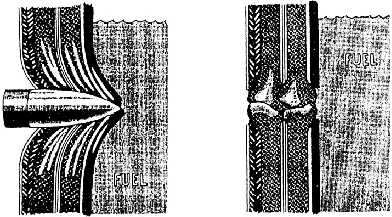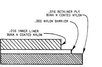 by leaking fuel. It keeps the aircrafts fuel intact so the aircraft may continue operating and return to its base. The most commonly used types of self-sealing fuel cells are the standard construction type and the type that uses a bladder along with the self-sealing cell. Of the two, the standard construction cell is use the most. It is a semiflexible cell, made up of numerous plies of material. The combination bladder and self-sealing cell is made up of two parts. One part is a bladder-type cell, and the other part is identical to the standard construction cell. It is designed to self-seal holes or damage in the bottom and the lower portions of the side areas. The bladder part of the cell (nonself-sealing) is usually restricted to the upper portion. This type of cell is also semi flexible.SELF-SEALING CELL (STANDARD CONSTRUCTION). There are four primary layers of materials used in the construction of a self-sealing cell. These layers are the inner liner, nylon fuel barrier, sealant, and retainer. All self-sealing fuel cells now in service contain these four primary layers of materials. If additional plies are used in the construction of the cell, they will be related to one of the primary plies.The inner liner material is the material used inside the cell. It is constructed of Buna N synthetic rubber. Its purpose is to contain the fuel and prevent it from coming in contact with the sealant. This will prevent premature swelling or deterioration of the sealant. Buna rubber is an artificial substitute for crude or natural rubber. It is produced from butadiene and sodium, and is made in two types, Buna S and Buna N. The Buna S is the most common type of synthetic rubber. It is unsuitable for use as inner liner material in fuel cells. It causes the petroleum fuels used in aircraft to swell and eventually dissolve. The Buna N is not affected by petroleum fuels, making it ideal for this application. However, the Buna N is slightly porous, making it necessary to use a nylon barrier to prevent the fuel from contacting the sealant.The nylon fuel barrier is an unbroken film of nylon. The purpose of the nylon fuel barrier is to prevent the fuel from diffusing farther into the cell. The nylon is brushed, swabbed, or sprayed in three or four hot coats to the outer surface of the inner liner during construction.The sealant material is the next material used in fuel cell construction. It remains dormant in the fuel cell until the cell is ruptured or penetrated by a projectile. It is the function of the sealant to seal the ruptured area. This will keep the fuel from flowing through to the exterior of the fuel cell (fig. 3-31.) The mechanical reaction results because rubber, both natural and synthetic, will "give" under the shock of impact. This will limit damage to a small hole in the fuel cell. The fuel cell materials will allow the projectile to enter or leave the cell, and then the materials will return to their original position. This mechanical reaction is almost instantaneous. The chemical reaction takes place as soon as fuel vapors penetrate through the inner liner material and reach the sealant. The sealant, upon contact with fuel vapors, will extend or swell to several times its normal size. This effectively closes the rupture and prevents the fuel from escaping. The sealant is made from natural gum rubber.