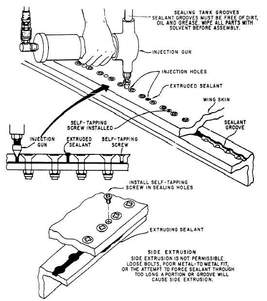 Maintenance Leaks are the most common trouble encountered with the integral fuel cells. Slight leaks may sometimes be repaired simply by retorquing (tightening) the bolts or screws on either side of the leak. On others it is often necessary to reseal the injection groove around the perimeter of the wing, and replace the O-rings and washers. Both of these procedures are described in the following text.RETORQUING. You should always retorque to stop a fuel stain or seepage before attempting to reseal. The first step in stopping a leak is to retorque the bolts or screws for 6 inches on each side of the leaking area according to the torque values given in the MIM for the different size bolts and screws being used. Standard bolts are used primarily in attaching wing skin and should be torqued from the nut side according to standard torque tables.REPLACING SEALS. If, after retorquing, the leak still persists around a bolt and washer seal, replace the seal with a new one. Be sure to install a washer between the bolt head and the seal or leakage will still occur. Also, be sure to torque the bolts according to the torque values listed in the MIM.If the leak is around an O-ring seal, replace the O-ring. First, loosen the bolt or screw with a steady pressure. Back out the bolt only as far as necessary to remove the O-ring over the head of the bolt or screw. Use petrolatum (Vaseline) if desired. Install a new O-ring and tighten the bolt to the required torque. The bolt should not be completely removed because of the possibility of cross threading during re-installation. Cross threading could result in the loss of a structural fastener by stripped threads on the nut plate or by the threads locking and twisting.REINFECTING SEALANT. If the leak is at the perimeter of the tank, reinject the sealant. You should use integral fuel tank groove injector compound and fill the groove sealant injector gun.NOTE: Be sure that the gun is filled in such a manner that no air is trapped in the sealant. Provide air pressure at the inlet of the gun according to the gun manufacturers instruc-tions.CAUTION The ability of the sealant compound to seal depends upon its adhesion to metal. Oils and greases are adhesion breakers and MUST be completely removed from all sealing areas, injection tools, and your hands when operating or servicing the injection gun. Some common contaminants are hair oils, body oils, and protective hand creams.Remove the screws from the injection holes of the area to be sealed, and place the sealant gun nozzle tip into the countersink of the injection hole. See figure 3-35. Special fittings may be attached between the gun tip and the barrel for use in areas of limited accessibility. Hold the gun firmly in position and depress the trigger until a plug of sealing compound at least 1 inch in length flows out of the next adjacent injection screw hole.CAUTION It is essential that the groove between injection holes be filled by injection from one direction only. If the sealant is forced into these areas from two directions, it is possible that air bubbles will be trapped in the groove. When injection has been inadvertently made from two directions, sealant should be injected from one side until a plug of sealant 5 inches long has been extruded.![]() Figure 3-35.Injection of sealing compound. NOTE: The trigger must be released approximately every 30 seconds to allow the gun piston to return before another cycle can begin.Replace the screw in the hole that has just been injected. Proceed in the same manner on the next adjacent hole (the one from which sealant has protruded) until the area to be resealed is completed. After all injection hole screws have been installed, remove excess sealing compound from the wing by scraping with a wood or plastic blade. The area may be cleaned with solvent.CAUTION Do not use toluene for cleaning any surface with a corrosion-resistant or fuel-resistant coating. Toluene will remove the coating and cause the loss of the coatings protective properties.If the sealant is exceptionally slow to inject, the tank may be heated to 110F. Heating can be accomplished by using electric blankets.CAUTION Do not heat the tank in excess of 110F to seal the injection groove as higher temperatures are considered as a fire hazard.The proper temperatures for sealing are 79 to 84F. If the tank is exposed to temperatures below 50F, the tank must be heated above 70F before sealing is attempted. This may be accomplished in a heated hangar or by using portable heating units or electric blankets. NOTE: If the sealing compound does not appear after approximately 4 to 5 minutes, you may assume that the compound is too cold, the groove is plugged, or the surface gap is excessive. In this case, the injection should be discontinued until the discrepancy is remedied. |
