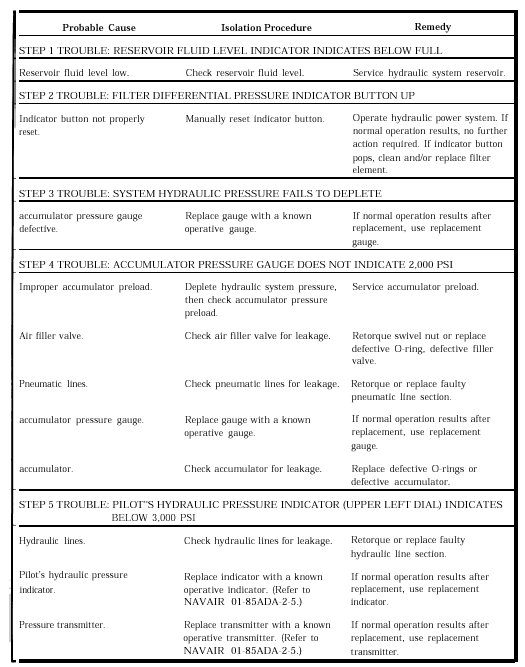 Schematic Diagrams Figure 3-8 is another example of a schematic diagram. Diagrams of this type do not indicate the actual physical location of the individual components in the aircraft. They do locate components with respect to each other within the system. Various components are indicated by symbols in schematic diagrams, while drawings of the actual components are used in the installation (pictorial) diagrams. The symbols used in the schematic diagrams conform to the military standard mechanical symbols provided in MIL-STD-17B-1 and MIL-STD-17B-2. Most manufacturers improve upon these basic symbols by showing a cutaway portion on each component. These cutaways aid in clarifying the operation of that component. You should be able to trace the flow of fluid from component to component. On most diagrams of this type, an uncolored legend or different colors are used to represent the various lines. The legend identifies the lines in relation to their purpose and the mode of operation being represented. Each component is further identified by name, and its location within the system can be determined by noting which lines lead into and out of the component.Since many systems are electrically controlled, you should be capable of reading the electrical portion of a schematic diagram. Knowledge of the electrical symbols and the use of a multimeter in making voltage and continuity checks will contribute significantly to efficient troubleshooting. If a malfunction is caused by electrical problems, the assistance of AE personnel may be required.All electrical wiring in the aircraft is marked at specified intervals with a wire identification code. These identification codes are defined in the electrical volume(s) of the MIM, and they are useful in tracing wires throughout the aircraft. If an elusive malfunction is reasonably traced to or considered to be of an electrical nature, the electrical circuit should be checked by a qualified AE. Many wires can give a good continuity reading under a no-load or low-current condition and still be malfunctioning when under a load condition.NOTE: Electrical schematics are especially useful in determining annunciator panel malfunctions.Installation Diagrams Figure 3-9 is an example of an installation diagram. This is a diagram of the motor-driven hydraulic pumpTable 3-1 Troubleshooting Flight Hydraulic Power System