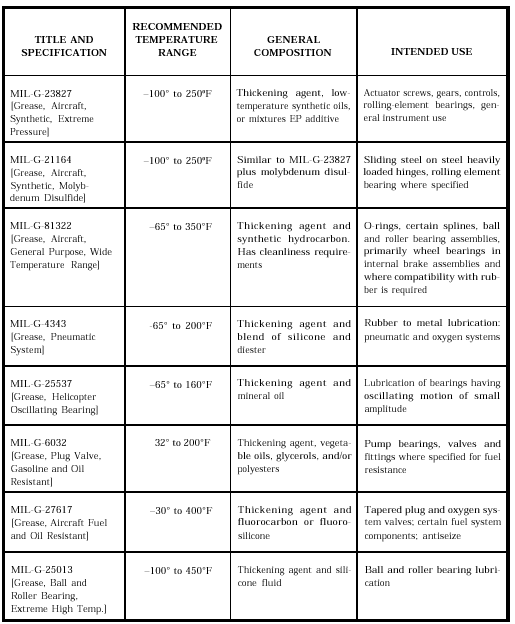 LUBRICANTS You can get lubricants in three forms. hey are fluids, semisolids and solids. Additives improve the physical properties or performance of a lubricant. We all know that oils are fluids, and greases are semisolids. You probably think of graphite, molybdenum disulfide, talc, and boron nitride as additives. In fact, they are solid lubricants. A solid lubricants molecular structure is such that its platelets will readily slide over each other. Solid lubricants can be suspended in oils and greases.There are many different types of approved lubricants in use for naval aircraft. Because the lubricants used will vary with types of aircraft and equipment, it is impractical to cover each type. Some of the more common types are described in table 3-5.Methods of Application Different types of lubricants maybe applied by any one of several methods. Common methods are by grease gun, by oil/squirt cans, by hand, and by brush.GREASE GUNS. There are numerous types and sizes of grease guns available for different equipment applications. The lever and one-handed lever guns are two of the most common types in use. The grease gun may be equipped with a flexible hose instead of a rigid extension. Different nozzles can be attached to the Table 3-5.Common Military