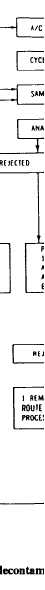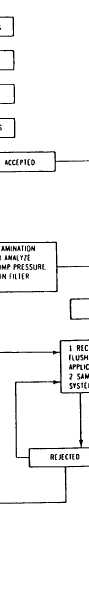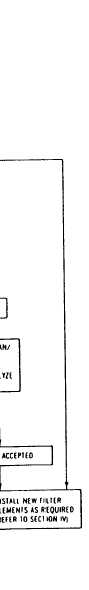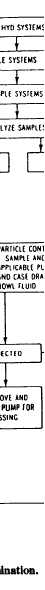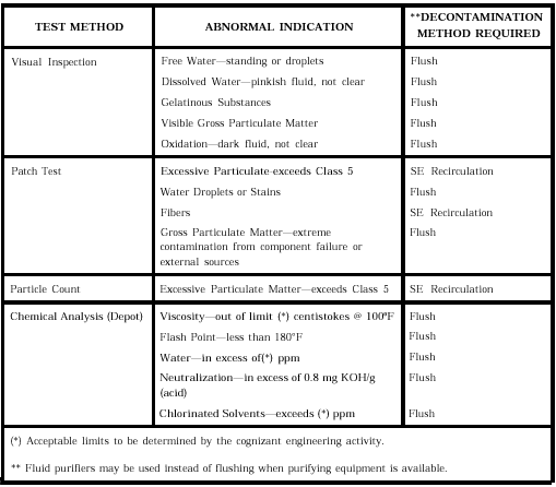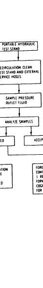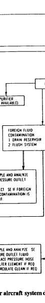 SELECTION OF METHOD The type of contamination present in a system determines the method by which a system is decontaminated. Normally, recirculation cleaning is the most effective decontamination method, considering maintenance man-hours and material requirements. This method should be used whenever possible. However, if a system is contaminated by some substance other than readily filterable particles, it may be necessary to flush the system, or in certain very extreme cases, to purge it. Refer to table 4-3. The table contains information to help you select an appropriate decontamination method. The table refers to chemical analysis and particle counting, as well as to the normally performed patch testing and visual tests. You may request chemical analysis and actua particle counts of fluid samples from the NADEP materials engineering laboratories. You may use these test results to select a decontamination method.CONTAMINATION CONTROL SEQUENCE System decontamination is one operation of a contamination control sequence that includes hydraulic fluid sampling and analysis. Decon-tamination is performed when the results of sampling and analysis indicate an unacceptable contamination level. Then, additional testing determines when an acceptable level is reached. There are many operations required during the contamination control sequence, and these operations interact during the sequence. Figure 4-7 is a basic contamination control sequence chart for aircraft system decontamination. It is a guide for decon-taminating all naval aircraft and portable hydraulic test stands. The procedures outlined in the chart reflect basic requirements of periodic maintenance, Table 4-3.Aircraft