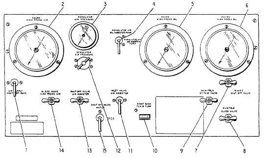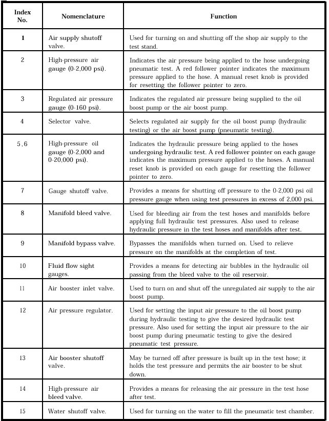 STAND (CGS SCIENTIFIC CORP) The hose burst test stand, shown in figure 5-18, is manufactured by CGS Scientific Corporation. This test stand provides a means for pressure testing of aircraft hose assemblies of various lengths and sizes. Hydraulic pressure up to 15,000 psi and pneumatic pressure up to 1,500 psi are available for the testing of the hoses. The test stand is a completely self-contained unit mounted on legs that permits bolting to the deck. Access doors and removable panels provide easy access to all components for maintenance. Figure 5-19 shows the controls and instruments, and table 5-7 lists the functions of each. You should be familiar with these controls and
