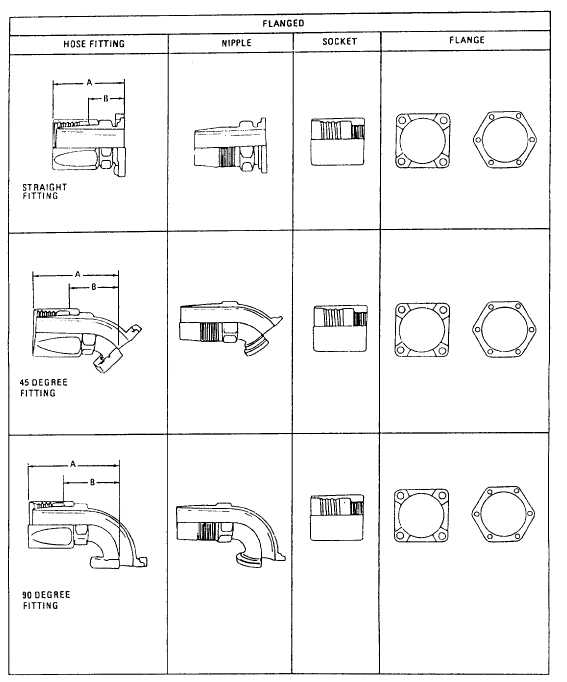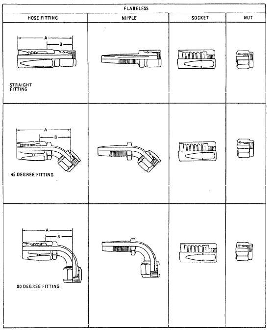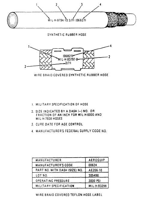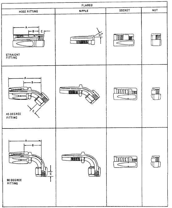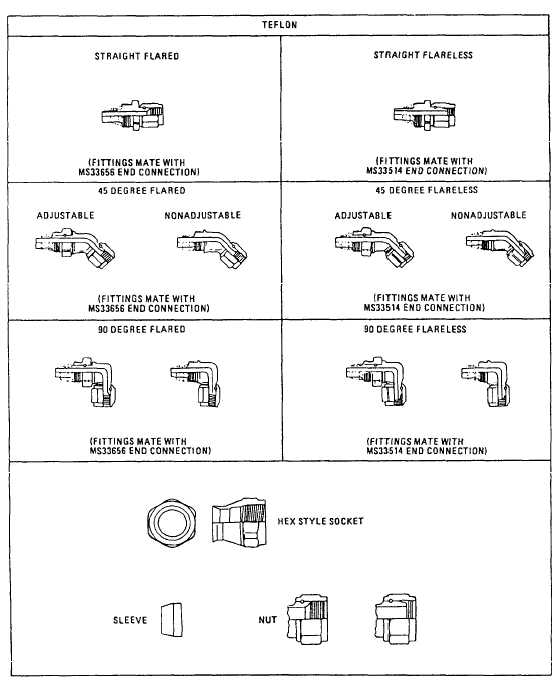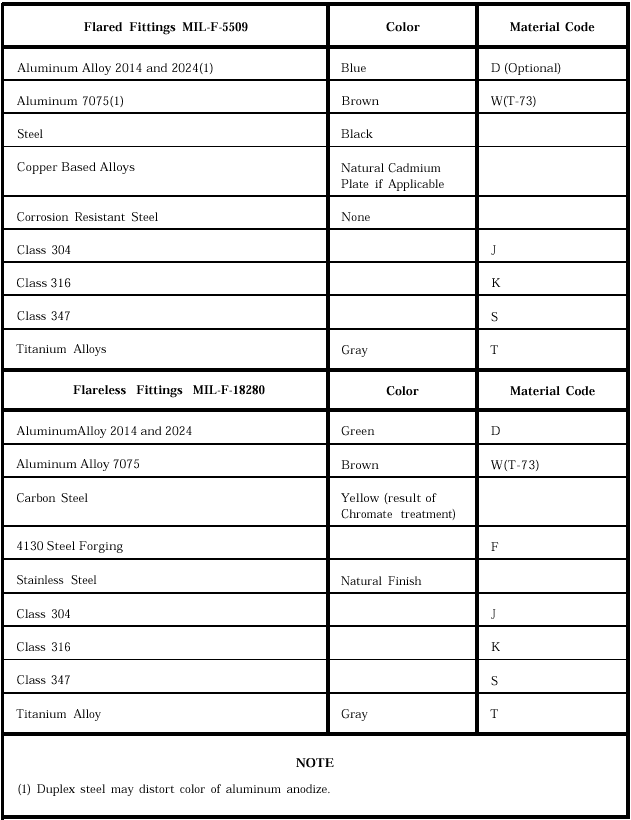 Hose fittings are identified by applicable military specification (MS) and manufacturers name or trademark on fittings and nuts. Flared or flareless fittings and nuts are color-coded to show materials or material finishes. See table 5-1.