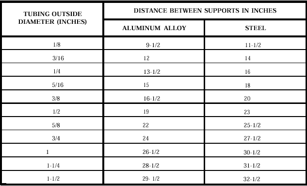 Figure 6-22.Cushioned steel clamp MIL-C-85052. by hand until resistance to turning develops. If it is impossible to use fingers to run nut down, use a wrench. Look out for the first signs of bottoming. Do not use pliers to tighten tube connectors.Final tightening should begin at the point where the nut begins to bottom. Use a torque wrench if fitting is accessible and torque fitting. If a connection is not accessible for torque wrench, use a wrench to turn nut one-sixth turn while holding the connector with another wrench to prevent the connector from turning. A one-sixth turn equals the travel of one flat on a hex nut. Tighten nut an additional one-sixth turn if the connector leaks. Do not tighten fitting nut more than one-third of a turn (two flats on nuts). Loosen and completely disconnect the nut if the leak continues. Inspect fitting components for scores, cracks, foreign material, or damage from previous overtightening. Reassemble fitting. Fingertighten nut and repeat wrench tightening. It is important to tighten tube fitting nuts properly. A fitting wrench or an open-end wrench should be used when tightening connections.All hydraulic tubing should be supported from rigid structures by cushioned steel clamps MIL-C-85052 or multiple tube block clamps. See figure 6-22. Hydraulic tubing support clamps should be installed and maintained in the positions described in the MIM or applicable technical directives. Unless otherwise specified, where tubing is supported to structure or other rigid members, a minimum clearance of 1/16 inch or where related motion of adjoining components exists, a minimum clearance of 1/4 inch is to be maintained. Table 6-10 shows the maximum allowable distance betweenTable 6-10.Maximum Distance