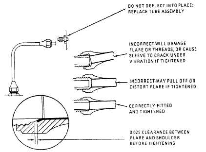 Installation of tube assemblies involves a preinstallation check before tube assemblies can be installed. Before you install tube assemblies, check to make sure there are no dents, nicks, and scratches; that the assembly contains the correct nuts and sleeves; that there is a proper fit, where fitting is flared; that a proof pressure test is performed on each assembly; and that the assemblies are clean. To install tube assemblies, hand screw the nuts onto mating connectors. Align the tube assembly in place so that it will not be necessary to pull it into place with the nut. Tubing that runs through cutouts should be installed to avoid scarring when the tubing is worked through a hole. If the tube assembly is long, tape the edge of cutouts before installing the assembly. Torque the nuts. Apply a protective coating to the remaining nonsealed joints after tubing is installed. For disconnected nonsealed joints, apply MIL-S-8802, followed by appropriate paint system, if required. For connected nonsealed joints, apply the first coat of MIL-C-16173, grade 4; 1 hour after applying the first coat, apply the second coat of MIL-C-16173, grade 4. Correct and incorrect methods of installing flared tube assemblies are shown in figure 6-21. Leakage of a flared tube assembly is usually caused by the following: If an aluminum alloy flared tube assembly leaks Flare distorted into the nut threads. Sleeve cracked. Flare out of round. Flare cracked or split. Inside of flare rough or scratched. Connector mating surface rough or scratched. Connector threads or nuts are dirty, damaged, or broken. after it has been tightened to the required torque, disassemble it for repair or replacement. If a steel flared tube assembly leaks, it may be tightened one-sixteenth turn beyond the noted torque. If the assembly continues to leak, it should be disassembled for repair or replacement. Do not tighten a nut when there is pressure in the line. Do not overtighten a leaking aluminum alloy assembly. Overtightening may severely damage or cut off tubing flare, or damage sleeve or nut. When you install flareless tube assemblies, proceed as follows: Make sure no nicks or scratches are evident and the sleeve is preset. Tighten the nut