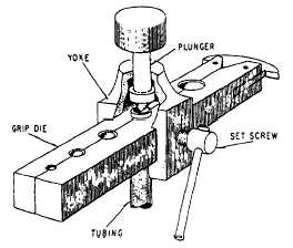 Figure 6-12.Tube flaring toot (single-flare). tighten the yoke setscrew to secure the tube in the grip die and hold the yoke in place. Strike the top of the plunger several light blows with a hammer or mallet, turning the plunger a half turn after each blow. Loosen the setscrew and remove the tube from the grip die. Check to make sure that no cracks are evident and that the flared end of the tube is no larger than the largest diameter of the sleeve being used. The double-flare tube joint is used on all 5052 aluminum alloy tubes with less than 1/2-inch outside diameter, except when used with NAS 590 series tube fittings and NAS 591 connectors or NAS 593 con-nectors. Aluminum alloy tubing used in low-pressure oxygen systems or corrosion-resistant steel used in brake systems must be double flared. Double flare reduces the chance of cutting the flare by overtightening. When fabricating oxygen lines, make sure that all tube material and tools are kept free of oil and grease. Use the tube flaring tool (fig. 6-13) to prepare tube ends. Check tube end for roundness, square cut, cleanliness, and make sure there are no draw marks or scratches. Draw marks can split the tubing when it is flared.