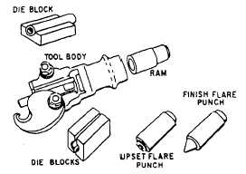 Use a deburring tool to remove burrs from the inside and outside of tube. Remove filings, chips, and grit from inside the tube. Clean the tube. Select the proper size die blocks, and place one-half of the die block into the flaring tool body with the countersunk end towards the ram guide. Install the nut and sleeve, and lay the tube in the die block with 1/2 inch protruding beyond countersunk end. Place the other half of the die block into the tool body, close latch plate, and tighten the clamp nuts fingertight. Insert the upset flare punch in the tool body with the gauge end toward the die blocks. The upset flare punch has one end counterbored or recessed to gauge the amount of tubing needed to form a double lap flare. Insert the ram and tap lightly with a hammer or mallet until the upset flare punch contacts the die blocks, and the die blocks are set against the stop plate on the bottom. Use a wrench to tighten the latch plate nuts alternately, beginning with the closed side, to prevent distortion of the tool. Reverse the upset flare punch; insert the upset flare punch and ram into the tool body. Tap lightly with a hammer or mallet until the upset flare punch contacts the die blocks. Remove the upset flare punch and ram. Insert the finishing flare punch and ram. Tap the ram lightly until a good seat is formed (fig. 6-14). Check the seat at intervals during the finishing operation to avoid overseating. |