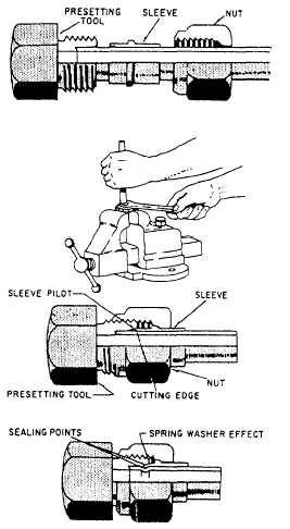 Flareless Fitting Preparing tube ends for flareless fitting requires a presetting operation whereby the sleeve is set onto the tubing. Presetting is necessary to form the seal between the sleeve and the tube without damaging the connector. Presetting should always be accomplished with a presetting tool, such as the one shown in figure 6-15. These tools are machined from tool steel and hardened so that they may be used with a minimum of distortion and wear.