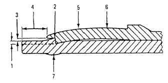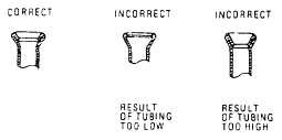 Figure 6-16.Preset sleeve. cannot be rotated with thumb and fingers. At this point the cutting edge of the sleeve is gripping the tube and preventing tube rotation; the fitting is ready for the final tightening force needed to set the sleeve on the tube. Tighten the nut to the number of turns specified in NAVAIR 01-1A-20.After presetting, unscrew the nut from the presetting tool or flareless fitting body; check the sleeve and tube (fig. 6-16). Sleeve cutting lip should be imbedded into the tubes outside diameter between 0.003 inch and 0.008 inch, depending on size and tubing material. A lip of tube material will be raised under the sleeve pilot. The sleeve pilot should contact or be quite close to the outside diameter of tube. The tube projection from the sleeve pilot to the tube end should be as listed in table 6-5. The sleeve should be bowed slightly. The sleeve may rotate on tube and have a maximum lengthwise movement of 1/64 inch. The sealing surface of the sleeve, which contacts theTable 6-5.Tube Projection