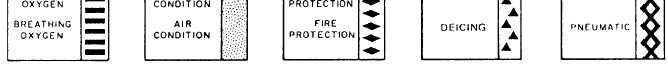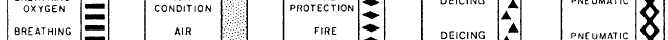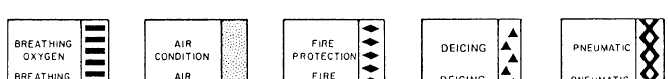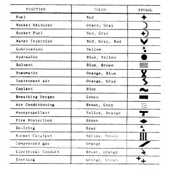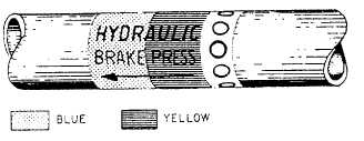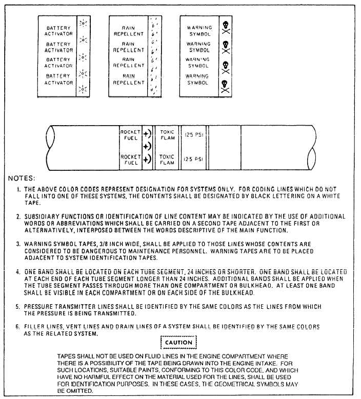 Figure 6-17.Fluid line identification application. stainless steel tubing currently installed on naval aircraft need not be removed. The basic reason for this is that cracked or damaged paint systems establish a differential oxygen concentration cell, which may result in tubing corrosion damage. Do not paint interior surfaces of airspeed indicator tubing, oxygen, or other plumbing lines. Tube assemblies located inside of an aircraft are interior tube assemblies. Tube assemblies located outside of an aircraft are exterior tube assemblies. Interior tube assemblies require a protective finish of two coats of zinc chromate, using application techniques as specified in in NA01-1A-509.IDENTIFICATION Fabricated tube assemblies should be identified before installation or storage. All information from the identification tag of the removed tube assembly should be transferred to the tag on replacement tube assembly. Identify the tube assemblies by ink stamping or stenciling the part number, manu-facturers code, and other required data on tube assemblies. Apply a protective coat of clear varnish over the markings. To aid in the rapid identification of the various tubing systems and operating pressure, each fluid line in the aircraft is identified by bands of paint or strips of tape around the line near each fitting. These identifying media are applied at least once in each compartment. Various other information is also applied to the lines.Identification tapes are applied to all lines less than 4 inches in diameter except cold lines, hot lines, lines in oily environment, and lines in engine compartments where there is a possibility of the tape being drawn into the engine intake. In these cases, and all others where tapes should not be used, painted identification is applied to the lines.Identification tape codes indicate the function, contents, hazards, direction of flow, and pressure in the fluid line. These tapes are applied in accordance with MIL-STD-1247C. This military standard was issued to standardize fluid line identification throughout the Department of Defense. Figure 6-17 shows the method of applying these tapes as specified by this standard.The function of a line is identified by use of a tape, approximately 1 inch wide, upon which word(s), color(s), and geometric symbols are printed. Functional identification markings, as provided in MIL-STD-1247C, are the subject of international standardization agreements. Three-fourths of the total width on the left side of the tape has a code color or colors that indicate one function only per color or colors. The function of the line is printed in English across the colored portion of the tape. Even a non-English-speaking person can troubleshoot or maintain the aircraft if he/she knows the code but cannot read English. The right-hand one-fourth of the functional identification tape contains a geometric design rather than the color(s) or word(s). Figure 6-18 is a listing, in tabular form, of functions and their associated identification media as used on