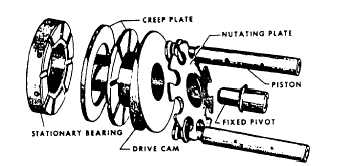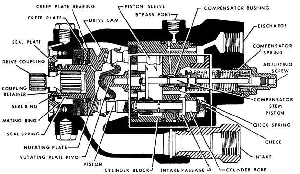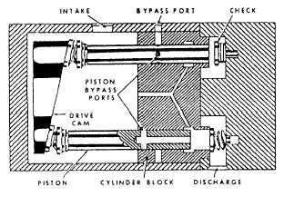 cam. Fluid Displacement. A schematic diagram of the displacement of fluid is shown in figure 7-18. Fluid is displaced by axial motion of the pistons. As each piston advances in its respective cylinder block