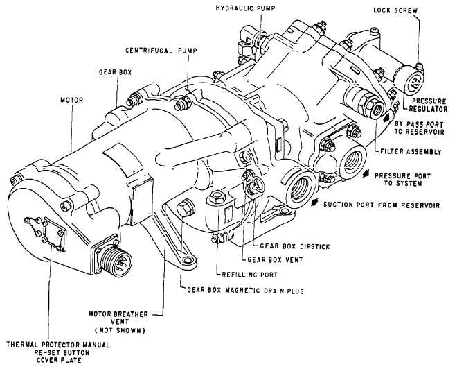 VARIABLE DIS-PLACEMENT). This type of pump is used in some of the Navys most modern aircraft. Motor-driven variable displacement pumps have several advantages over the engine-driven models. Some of these advantages are as follows: 1. Ease of installation and removal due to the accessibility of the component. 2. Constant speed of the drive shaft. 3. Eliminates the need of using a test stand to drop check the landing gear and perform operational checks of other actuating systems. NOTE: Hydraulic test stands are seldom used on aircraft that incorporate this type of pump because foreign particles could be transferred from the test stand to the aircraft, thus contaminating the hydraulic system.4. The pump assembly contains an internal centrifugal boost pump, which provides a positive fluid pressure at the suction port of the variable displacement pump.The only disadvantages of the pump are the size of the complete assembly and its weight. For this reason, this type of pump is used in patrol and transport aircraft.There are other features incorporated in the motor-driven variable displacement pump that you should know about. A thermal protector manual reset button is installed on the end of the motor, which is concealed by a cover plate. See figure 7-21. This thermal protector is a safety device that protects the motor from overheating. The reset button will open and stop the motor when the temperature exceeds 380 10F. If the motor does not restart after cooling, the cover plate over the reset button should be removed and the reset button reset manually. If the motor still fails to start, the motor pump assembly should be replaced.The motor-driven variable displacement pump suction line is connected from the reservoir to the suction port of the pump assembly, where fluid is ported into the center of a centrifugal pump scroll. The scroll is located between the main pump case and the motor reduction gearbox of the pump assembly. See figure 7-21. The scroll houses a centrifugal booster pump, which is mounted directly on the main pump shaft. The constant-speed motor turns the pump shaft through reduction gears at 3,200 rpm, which is sufficient to boost the fluid pressure about 15 to 20 psi above the existing reservoir pressure. The output of this integral pump is directed to two points on opposite sides of the scroll housing. See figure 7-22.One delivery point provides a constant flow of hydraulic fluid for motor cooling through an internal