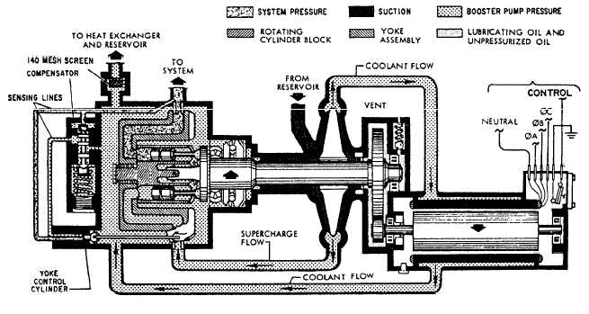 passage. Finned baffle-like passages direct this flow around the motor through the hollow-walled motor case, after which it is directed by an external line into the case of the piston pump. This constant flow through the low-pressure chamber of the main pump cools and lubricates all of its moving parts. It also picks up "blow-by" oil that escapes past the high-pressure pump pistons, and is discharged through a coarse-screen filter cartridge installed in the case drain port. The pumps coolant flow is routed through the aircrafts heat exchanger and back to the reservoir.The second delivery point from the integral centrifugal pump is directed from the centrifugal pump scroll at positive pressure to the intake port of the high-pressure pump. As you can see in figure 7-22, the Vickers motor-driven variable displacement design is similar to other engine-driven designs. The rotating assembly consists of a baseplate, to which nine piston rods are joined. The assembly turns in a fixed plane. Also turning with it is a cylindrical nine-piston block fitted inside a nonrotating yoke.The yoke is pivot-mounted to the pump case, and has an offset attachment for a compensator piston rod that controls the yokes attitude. If the yoke is not deflected, the cylinder block containing the pistons will rotate in a plane parallel to the baseplate, thus producing no stroke. The yoke can be tilted to displace the pistons, reaching maximum stroke when the yoke is tilted 30 degrees from the plane of rotation of the baseplate.The pump compensating mechanism receives a feedback signal of system pressure, and adjusts the pump output by tilting the yoke a prescribed amount to provide more or less flow. Whereas engine-driven pumps are generally rated to produce a given pressure and flow at a nominal drive speed, the electric motor-driven pump has a fixed rotational speed and a special compensating mechanism that enables the pump to provide 6 gpm (gallons per minute) at 2,950 to 3,000 psi. It will provide more flow as system pressure drops, reaching a maximum flow of 8 gpm at 2,200 psi. The accelerated flow enables the system to maintain normal speed of many actuators in use simultaneously.