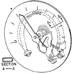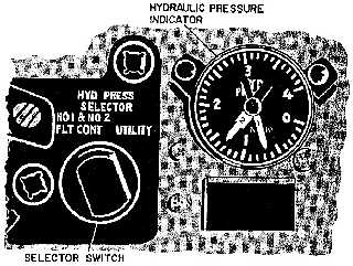 Figure 7-37.Typical hydraulic pressure indicator. and a hydraulic pressure selector switch and dual pointer indicator, both located on the pilots instrument panel.The transmitters operate on the Bourdon tube principle. Expansion and contraction of the Bourdon tube is transmitted by mechanical linkage to the rotor of a transmitter synchro. The synchro transmits an electrical signal through wiring to the pressure indicator. The indicator contains two synchros mechanically attached to the two separate pointers. When the HYD PRESS SELECTOR switch (fig. 7-37) is in the No. 1 and No. 2 FLT CONT position, the pointers (marked "1" and "2") indicate the pressure in their respective systems, independent of each other. When the HYD PRESS SELECTOR switch is in the UTILITY position, the synchros are connected in electrical parallel, and the pointers align with each other and act as one.Although the Aviation Electricians Mate is responsible for inspecting and maintaining all the aircraft gauges and other instruments, you must know how to read the hydraulic pressure gauge to inspect and maintain the hydraulic system.Pressure gauges on some naval aircraft are calibrated to register from 0 to 2,000 psi; on others they register from 0 to 4,000 psi. The gauge in figure 7-37 is an example of the latter type. As shown in figure 7-37, on gauges designed for a range of 0 to 4,000 psi, the dial is calibrated with four major markings with the numerals 1,2,3, and 4. One major intermediate graduation between each numeral and four minor intermediate markings between the major markings are for reading to the