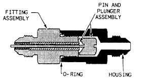 GAUGE AND PRESSURE TRANSMITTER SNUBBERS A gauge and pressure transmitter snubber is a hydraulic component located upstream of pressure gauges and pressure transmitters. Its purpose is to damper out system pressure surges that could cause possible damage to gauges and pressure transmitters. Snubbers also prevent cockpit hydraulic indicators from oscillating and fluctuating, which makes accurate reading of the gauge not only difficult but often impossible. Without the use of a snubber, pressure oscillations and other sudden pressure changes existing in hydraulic systems could affect the delicate internal mechanism of both gauges and transmitters. This may cause either complete destruction of the gauge or transmitter or, often worse, partial damage, resulting in false readings. The basic components of a snubber are the housing, fitting assembly with a fixed orifice diameter, and the pin and plunger assembly, as shown in figure 7-39. The snubbing action is obtained by metering fluid through the snubber. The fitting assembly orifice restricts the amount of fluid that flows to the gauge or pressure transmitter, thereby snubbing the force of a pressure surge. The pin is pushed and pulled through the orifice of the fitting assembly by the plunger, keeping it clear and at a uniform size.