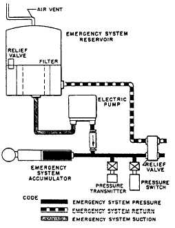 Figure 7-40.Schematic diagram of typical emergency power system (electric-motor driven).Figure 7-41 shows a typical ram air unit. This type of emergency system is intended for use only when normal hydraulic pumps are completely inoperative. Because of differences in system designs, aircraft emergency system operating pressures will differ from one aircraft to another. The ram air turbine system shown in figure 7-41 provides a means for emergency hydraulic and electrical power when the normal aircraft hydraulic system has failed. The turbine-driven hydraulic pump supplies fluid under pressure to the primary flight controls as well as to an emergency hydraulically driven alternator. The turbine system shown in figure 7-42 consists of a dropout governor-controlled turbine, a hydraulic
