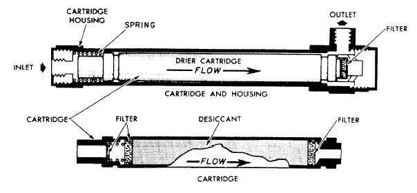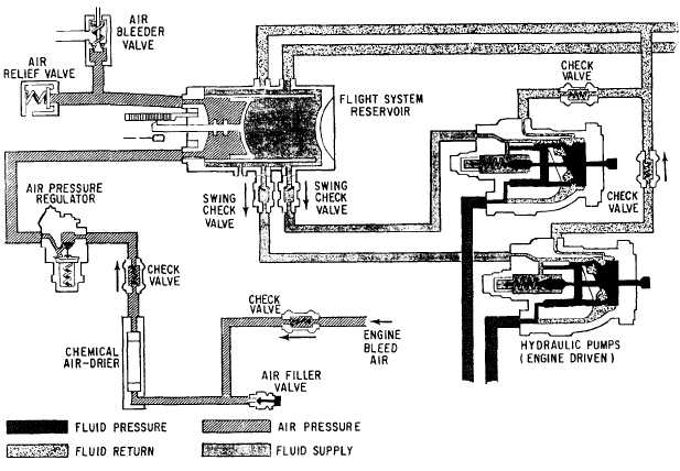 The reservoir is cylindrical in shape and has a piston installed internally to separate the air and fluid chambers. The piston rod end protrudes through the reservoir end cap and indicates the fluid quantity. The quantity indication may be seen by inspecting the distance the piston rod protrudes from the reservoir end cap. The reservoir has threaded openings for the connection of fittings and components. The schematic shown in figure 7-7 shows several components installed in lines leading to and from the reservoir; however, this may not be the case in the actual installation. The air relief valve, bleeder valve, etc., may be installed directly on the reservoir. Because the reservoir is pressurized, it can normally be installed at any attitude and still maintain a positive flow of fluid to the pump. |