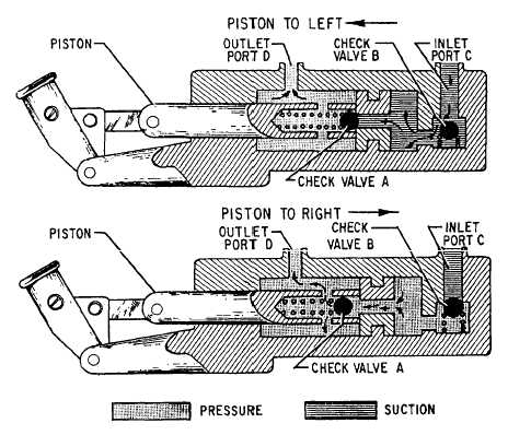 Hand Pumps Hand pumps are used in hydraulic systems to supply fluid under pressure to subsystems, such as the landing gear, flaps, canopy, and bomb-bay doors, and to charge brake accumulators. Systems using hand pumps are classified as emergency systems. Most of these systems may be used effectively during preventive maintenance.Double-action type of hand pumps are used in hydraulic systems. Double action means that a flow of fluid is created on each stroke of the pump handle instead of every other stroke, as in the single-action type. There are several versions of the double-action hand pump, but all use the reciprocating piston principle, and operation is similar to the one shown in figure 7-13.This pump consists of a cylinder, a piston containing a built-in check valve (A), a piston rod, an operating handle, and a check valve (B) at the inlet port. When the piston is moved to the left in the illustration, check valve (A) closes and check valve (B) opens.Fluid from the reservoir then flows into the cylinder through inlet port (C). When the piston is moved to the right, check valve (B) closes. The pressure created in the fluid then opens check valve (A), and fluid is admitted behind the piston. Because of the space occupied by the piston rod, there is room for only part of the fluid; therefore, the remainder is forced out port (D) into the pressure line. If the piston is again moved to the left, check valve (A) again closes. The fluid behind the piston is then forced through outlet port (D). At the same time, fluid from the reservoir flows into the cylinder through check