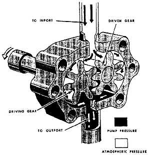 between the teeth is displaced into the outlet port. This action produces a positive flow of fluid under pressure into the pressure line. A shear pin or shear section that will break under excessive loads is incorporated in the drive shaft. This is to protect the engine accessory drive if pump failure is caused by excessive load or jamming of parts.All gear-type pumps are constant displacement pumps. These pumps are usually driven by a dc wound electric motor. For those aircraft using batteries, the pump may be used to build up hydraulic pressure for the brake system during towing operation.Maintenance of a pump at the organizational level consists of replacement of the complete assembly. The motor and pump may be ordered separately; however, this is normally done by intermediate- and depot-level maintenance only.Removal and installation procedures are found in the applicable MIM. The following removal procedures are typical examples.1. Relieve reservoir pressure. 2. Pull the pump circuit breaker and place a warning card, DO NOT OPERATE, on the pump switch. 3. Disconnect the pump motor electrical connection at the motor. 4. Drain the pump reservoir or cap the reservoir suction line. 5. Disconnect the drain line at the pump. 6. Loosen the pressure and suction lines "B" nuts. 7. Remove the mounting screws/bolts that secure the pump assembly to the aircraft structure. 8. Disconnect completely the pressure and reservoir suction lines at the pump. 9. Cap all open lines, and lift the pump assembly out of the aircraft. The following installation procedures are typical examples:1. Place the pump on the aircraft structure mounting pad. Connect the pressure and suction lines to the pump ports and tighten the "B" nuts fingertight. 2. Align and install the mounting screws/bolts. 3. Tighten the "B" nuts to the correct torque values. 4. Attach the electrical connection to the motor. 5. Service the reservoir to the proper level. 6. Perform operational check according to the applicable MIM. NOTE: Prior to the installation of hydraulic units, the preservation fluid must be drained and the unit flushed with clean hydraulic fluid. |