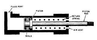 Single-Acting Actuating Cylinder The single-acting, piston-type cylinder uses fluid pressure to apply force in only one direction. In some designs of this type, the force of gravity moves the piston in the opposite direction. However, most cylinders of this type apply force in both directions. Fluid pressure provides the force in one direction, and spring tension provides the force in the opposite direction, In some single-acting cylinders, com-pressed air or nitrogen is used instead of a spring for movement in the direction opposite that achieved with fluid pressure.Figure 8-1 shows a single-acting, spring-loaded, piston-type actuating cylinder. In this cylinder the spring is located on the rod side of the piston. In some spring-loaded cylinders, the spring is located on the blank side, and the fluid port is located on the rod side of the cylinder.