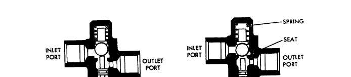 Mechanically-Operated Sequence Valve The body of the mechanically-operated (fig. 8-13) sequence valve is usually aluminum, and contains all the working parts. As for the number and location of the fluid ports, there are many variations, depending upon how the valve is to be used. At least two ports are needed. Some models have four ports, and those not needed are plugged. The valve shown in figure 8-13 has two ports.A contact plunger extends from the body. The plunger is held in the extended position by a plunger spring. The valve is mounted so that the plunger will be depressed by the first unit operated.A check valve, either a poppet or ball, is installed between the fluid ports of the body, and is held against a seat by the check valve spring. The seated check valve spring prevents fluid flow through the valve. The plunger, driven into the valve by the first unit, unseats the check.The balanced sequence valve will not permit fluid flow in either direction unless the plunger is depressed. This check valve, with equal working areas (balanced), cannot be unseated by fluid pressure in either direction. Thermal relief valves are needed in this system.The unbalanced valve can be unseated by fluid pressure below it without having the plunger depressed. This movement allows thermal expansion to be relieved. Thermal relief valves are NOT needed in this system.Pressure from the selector valve goes directly to the first unit. To operate the second unit, fluid must pass through the sequence valve, which it can do only when the check valve is unseated. On completing its operation, the first unit depresses the plunger on the sequence valve, which unseats the check valve and allows fluid to flow through the valve to second unit. Thus, the second unit cannot operate until the first unit operation is complete. In reverse, when contact force is removed from the plunger, the spring extends it and the check valve reseats.Improper adjustment of plungers on the mechanical-type sequence valve is the most common cause of trouble. If the adjustment is off, it could cause the second unit to operate too soon or not at all. The adjustment is made either on the plunger of the sequence valve or the striker that depresses the plunger.Adjustment should be checked at every periodic inspection. If a valve leaks internally, disassemble, clean, and inspect the check valve and its sealing surface. Replace faulty O-rings. Internal leakage could cause the second unit to operate before it should.
