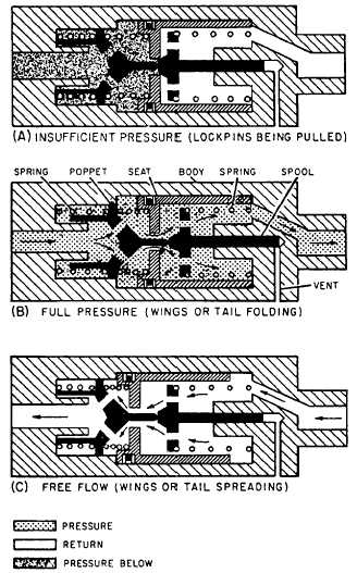 Pressure-Operated (Priority) Sequence Valve The pressure-operated sequence valve, also called a priority valve, looks like a check valve externally. Like a check valve, the installation position is indicated by an arrow. Figure 8-14 shows this valve installed in a wing fold system.During the wing folding cycle, pressure-operated (priority) valves sequence the movement of the lockpins and fold actuators. These valves ensure lockpin actuation before fold actuator operation. This completely automatic valve consists of a body containing a spool, seat, poppet, related springs, seals, and an end cap.When the wing fold selector valve is in the fold position, it directs fluid both to the wing lockpin and to the pressure-operated sequence (priority) valve. System pressure drops in the wing fold system because of the amount of pressurized fluid needed to actuate the lockpins. This lowers pressure below that needed to open the pressure-operated (priority) valve. View A of figure 8-14 shows insufficient pressure to unseat the spool. When lockpins have completed their travel, system pressure builds until it overcomes spring tension and causes the poppet to unseat the spool (view B of fig. 8-14). Fluid then flows freely through the valve to the wing fold actuators. View C of figure 8-14 shows the free-flow position of the valve. When spreading the wings, return fluid moves the seat from the spool compressing the poppet spring, which causes the poppet to bottom and allows free flow of fluid through the valve.SHUTTLE VALVES All aircraft incorporate emergency systems that provide alternate methods of operating essential systems required to land the aircraft safely. These emergency systems usually provide pneumatic or hydraulic operation of the essential systems; however, in some cases due to the design, they maybe operated satisfactorily through mechanical linkage. When using the pneumatic or hydraulic emergency system, that pressure must be directed to the unit concerned; emergency pressure must not enter the normal system, especially if the pneumatic type system is used. To allow operating pressure to reach the actuating unit and still not enter the other system, a shuttle valve is installed in the working line to the actuating unit. The main purpose of the shuttle valve