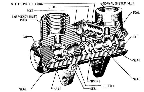Operation of Shuttle Valves When a shuttle valve is in the normal operating position, fluid has a free flow from the normal system inlet port to the unit outlet port. The shuttle is seated against the emergency inlet port, and held there by the shuttle spring or by normal system pressure. The shuttle remains in this position until the emergency fluid, gas, or air is released under pressure by the emergency control valve. The application of emergency pressure at the emergency inlet port forces the shuttle from the emergency inlet port seat to the normal system inlet port seat. The emergency pressure then has a free flow to the unit outlet port, but is prevented from entering the normal system by the shuttle.Maintenance of Shuttle Valves Shuttle valve maintenance is generally limited to repairing leakage. External leakage may generally be repaired by tightening the end caps. If this does not stop excessive leakage, the end cap O-rings should be replaced.Internal leakage can usually be repaired by removing and flushing the unit with clean hydraulic fluid. Excessive heating is a good indication of internal leakage through a shuttle valve. Excessive cycling of the emergency system pump is also an indication of a leaky shuttle valve.After an emergency system has been operated, all emergency system pressure should be bled off as soon as possible, and the normal system restored to operation.RESTRICTORS Restrictors are used in hydraulic systems to limit the flow of hydraulic fluid to or from actuators where speed control of the cylinders is necessary to provide specific actions. If control in one direction only is desired, a one-way restrictor is used. If restricted fluid flow both to and from an actuating cylinder is necessary, a two-way restrictor is installed.