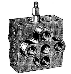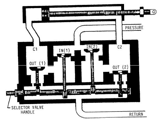 Poppet-Type Selector Valve Poppet-type selector valves are manufactured in both the balanced and unbalanced design. An unbalanced poppet selector valve offers unequal working areas on the poppets. The larger area of the poppet is in contact with the working lines of the system; consequently, when excessive pressure exists within the working lines due to thermal expansion, the poppet will open. This action allows the excessive pressurized fluid to flow into the pressure line, where it is relieved by the main system relief valve.The balanced poppet selector valve has equal poppet areas. The poppets will remain in the selected position during thermal expansion of working line fluid. For this reason, thermal relief valves are installed in working lines that incorporate balanced poppet selector valves.Figure 8-7 shows a typical four-port poppet selector valve. This is a manually operated valve, and consists of a group of conventional spring-loaded poppets. The poppets are enclosed in a common housing and interconnected by passageways to direct the flow of fluid in the desired direction.
