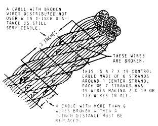 Broken wires are most apt to occur in lengths of cable that pass over pulleys or through fairleads. On certain periodic inspections, cables are checked for broken wires by passing a cloth along the length of the cable. Where the cloth snags the cable is an indication of one or more broken wires.WARNING Your bare hands should NEVER be used to check for broken wires. Using your bare hands to check for broken wires could result in personal injury.Tests have proven that control cables may have broken wires and still be capable of carrying their designated load. However, any 7 x 19 cable that shows more than six broken wires in any 1-inch length, or any 7 x 7 cable that shows more than three broken wires in any 1-inch length, must be replaced. A maximum of three broken wires per inch is allowable in the length of cables passing over pulleys, drums, or through fairleads. Figure 9-20 shows how to determine if a cable is serviceable. Corrosion, kinking, and excessive wear should be given particular attention during cable inspection. If a cable is found to be kinked or badly worn, it should