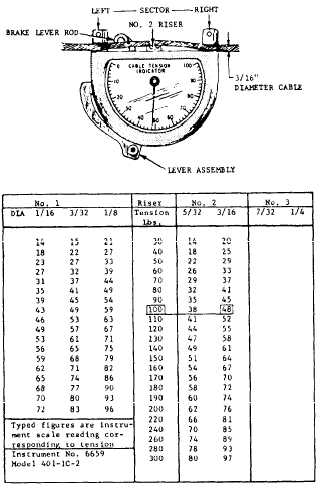 the amount of force required to deflect a cable a certain distance at right angles to its axis. The cable to be tested is placed under the two blocks on the instrument, and the lever assembly on the side of the instrument is pulled down. Movement of this lever pushes up on the center block, called a "riser." The riser pushes the cable at right angles to the two clamping points. The force required to do this is indicated by a pointer on the dial. Different risers are used with different size cables. Each riser carries an identifying number, and is easily inserted in the instrument.Each tensiometer is supplied with a calibration table to convert the dial readings into pounds. One of these calibration tables is shown in figure 9-23. For example, if the pointer on the dial indicates 48 with a No. 2 riser and a 3/16-inch diameter cable, the actual tension on the cable is 100 pounds. With this particular instrument, the No. 1 riser is used with 1/16-, 3/32-, and 1/8-inch diameter cables. CAUTION The calibration table applies to the particular instrument only, and cannot be used with any other. For this reason, the calibration table is secured inside the cover of the box in which the instrument is kept. The chart is serialized with the same serial number as the instrument. Using the cali-bration table from another instrument will result in inaccurate reading.During the adjustment of turnbuckles, the calibration table must be used to obtain the desired tension in a cable. For example, to obtain a tension of 110 pounds in a 3/16-inch diameter cable, the No. 2 riser is inserted in the instrument and the number opposite 110 pounds is read from the calibration table. In this case, the number is 52. The turnbuckle is then adjusted until the pointer indicates 52 on the dial.NOTE: Tensiometer readings should not be taken within 6 inches of any turnbuckle, end fitting, or quick disconnect.In some cases, the position of the tensiometer on the cable may be such that the face of the dial cannot be seen by the operator. In such cases, after the lever has been set and the pointer moved on the dial, the